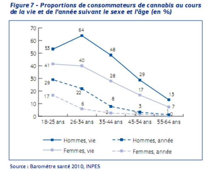 Le cannabis, drogue illicite la plus consommée en France, est devenu culturel, au même titre que le tabac et l’alcool, comme en témoigne le nombre important et stable d’usagers réguliers (plus d’un million). Cependant cette consommation concerne surtout les hommes de moins de 55 ans :