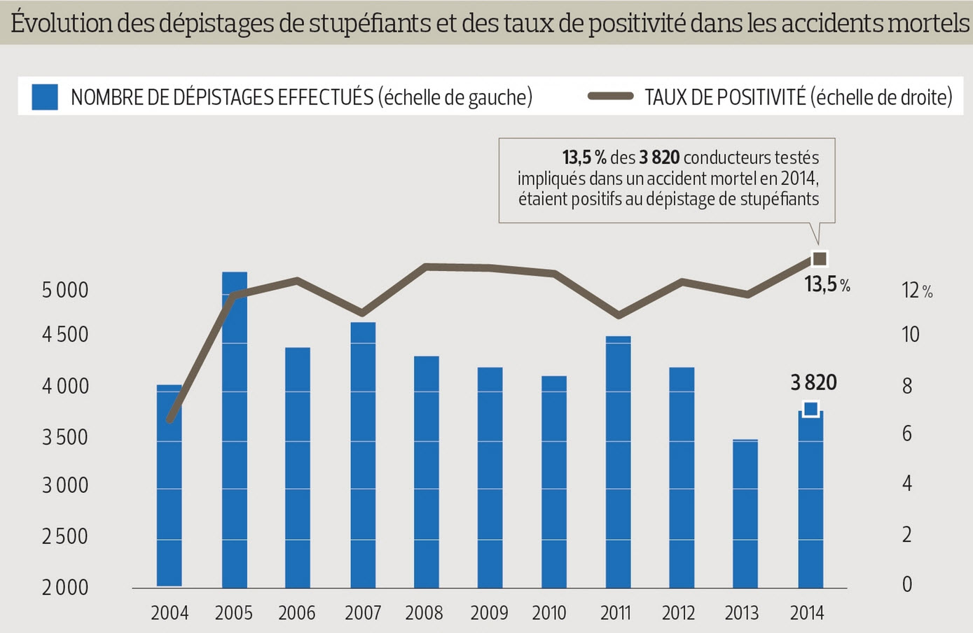 La part des conducteurs impliqués dans un accident mortel et qui ont pris de la drogue progresse. Elle a ainsi augmenté en 2014, à 13,5 %, contre 12 % en 2012. Comme les années précédentes, la tranche d’âge des 18-24 ans reste la plus exposée à ce fléau. Sous l’effet du cannabis, principalement dépisté lors des contrôles, le conducteur perd ses moyens, rappelle Jean-Pascal Assailly, psychologue et chercheur à l’Ifsttar (l’Institut français des sciences et technologies des transports, de l’aménagement et des réseaux). Ainsi, la vision périphérique est troublée et devient, selon ce spécialiste, «une vision en tunnel».