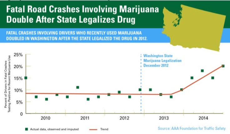 Dans l’état de Washington, en 2014, le nombre de conducteurs sous l’emprise du cannabis tués dans un accident mortel de la circulation a plus que doublé après la légalisation de la drogue, pour atteindre 17% selon les statistiques officielles.