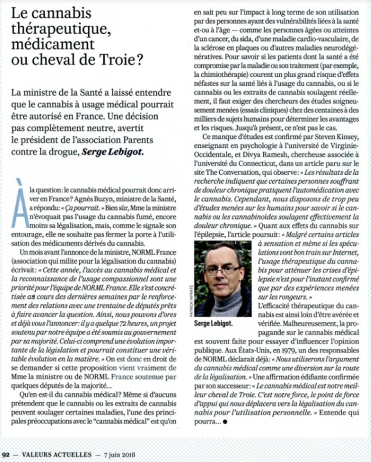 Mr Serge Lebigot, Président de l’association Parents contre la drogue dans un récent article de Valeurs Actuelles (ci-dessous) pose la question de l’intérêt de l’utilisation du cannabis. au motif d’un prétendu bénéfice thérapeutique. Rien n’est moins sur.