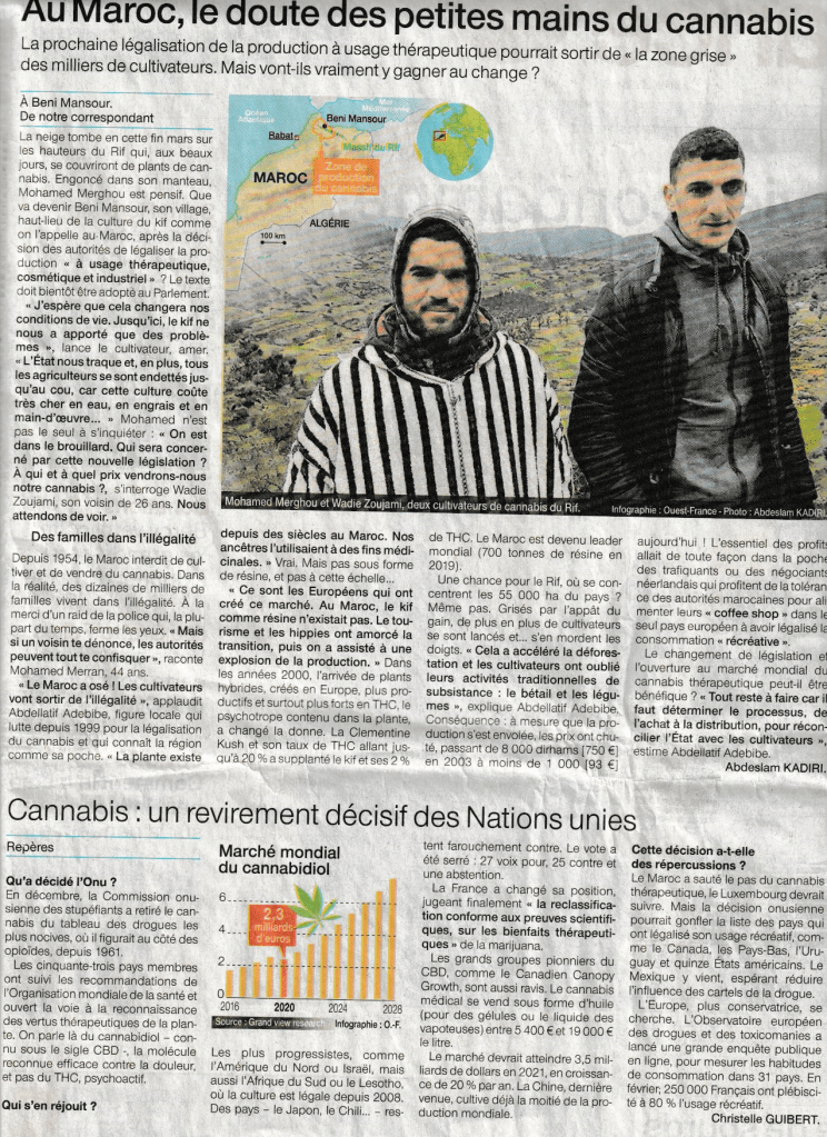 La neige tombe en cette fin mars sur les hauteurs du Rif qui, aux beaux jours, se couvriront de plants de cannabis. Engoncé dans son manteau, Mohamed Merghou est pensif. Que va devenir Beni Mansour, son village, haut-lieu de la culture du kif comme on l’appelle au Maroc, après